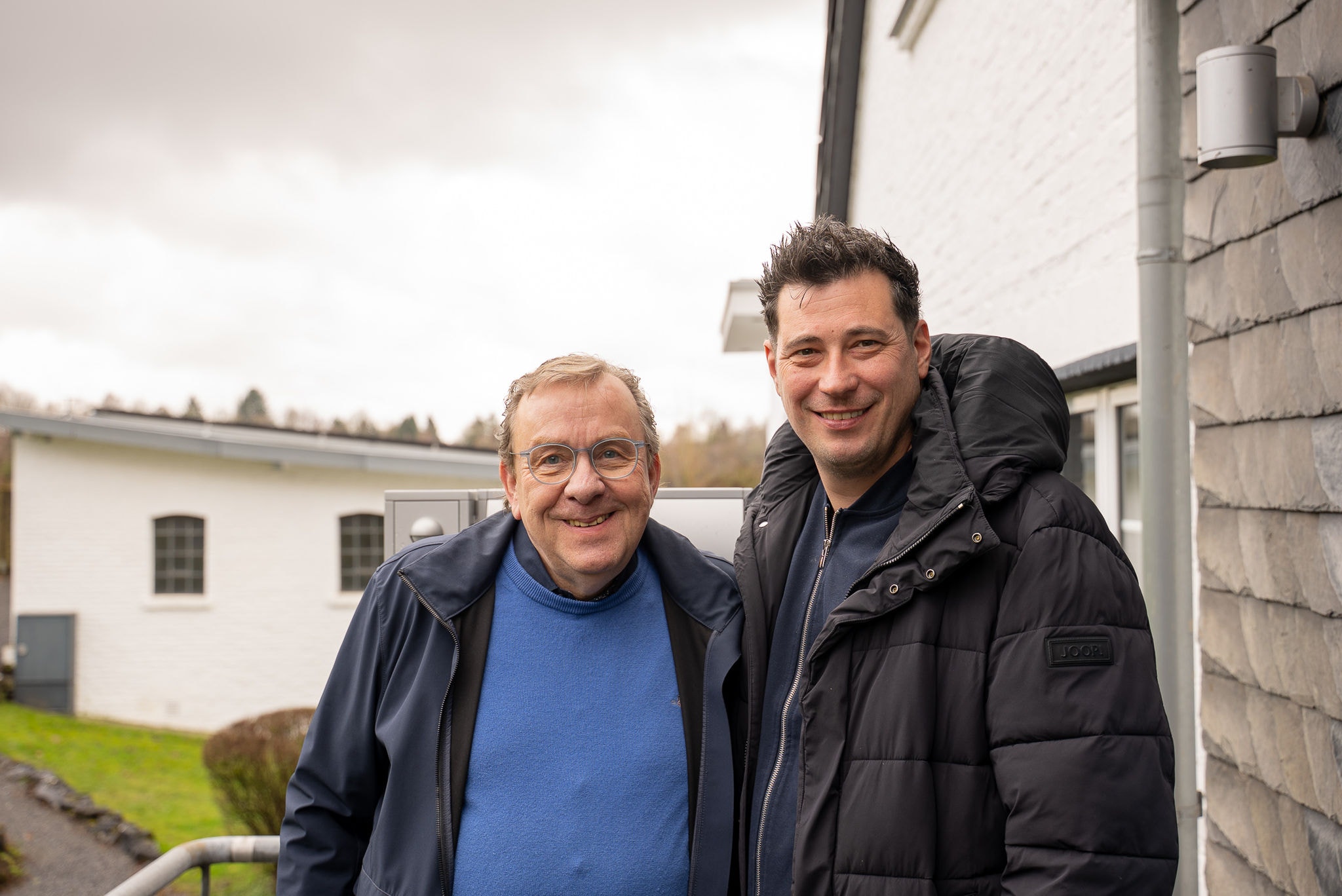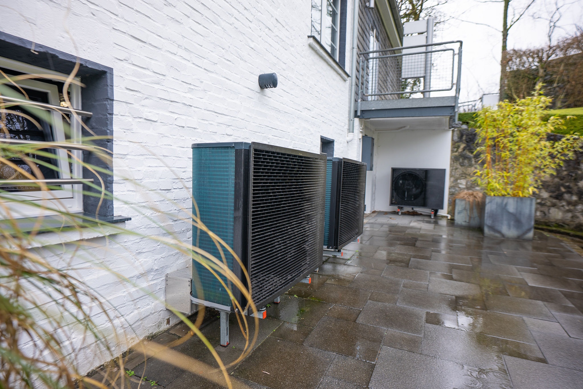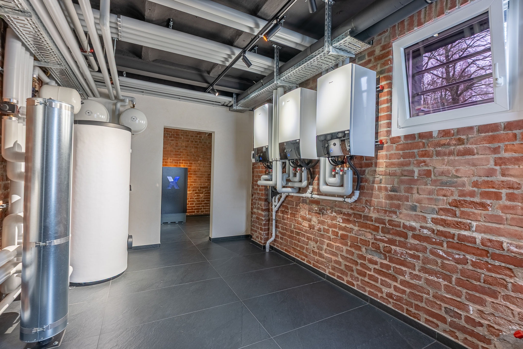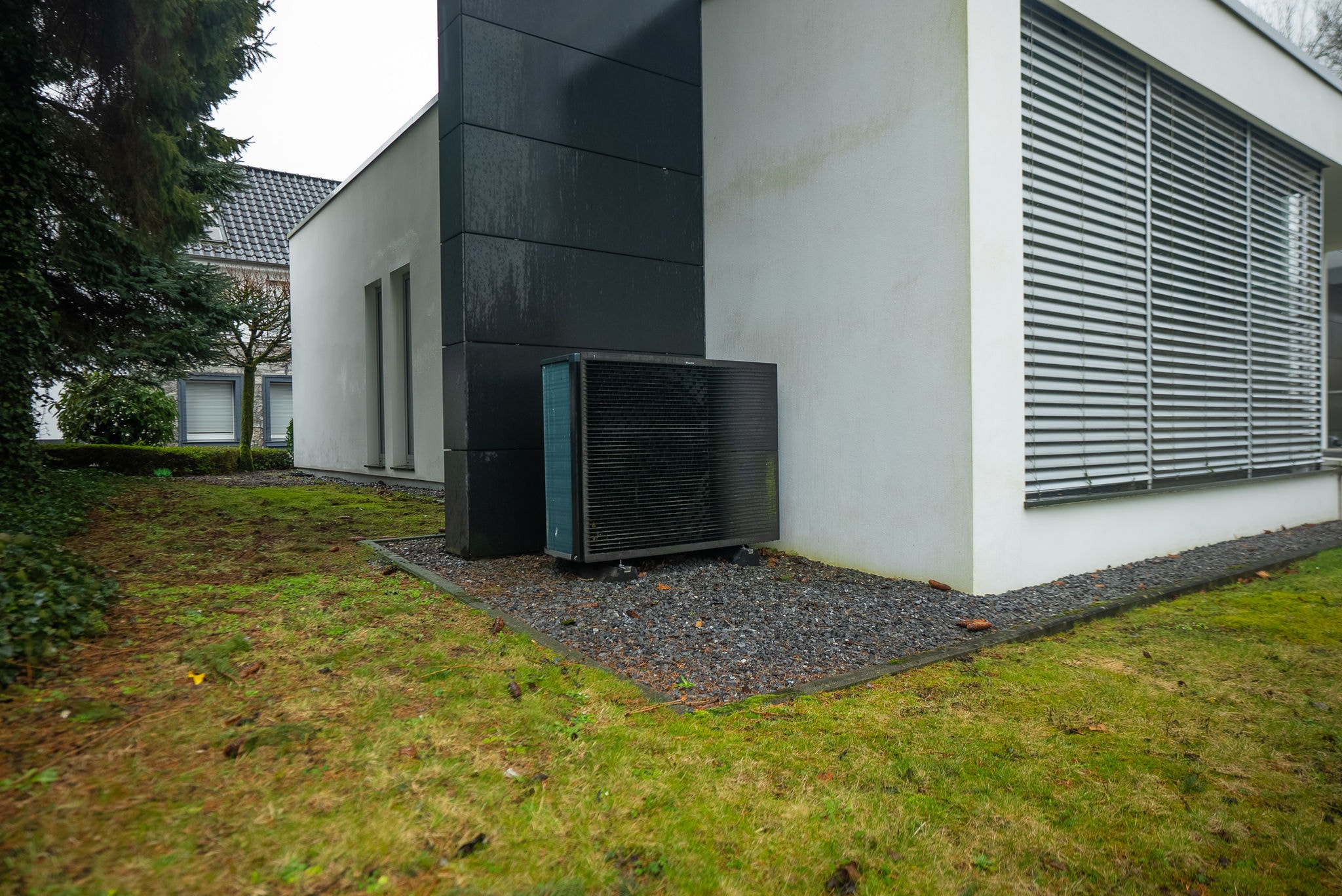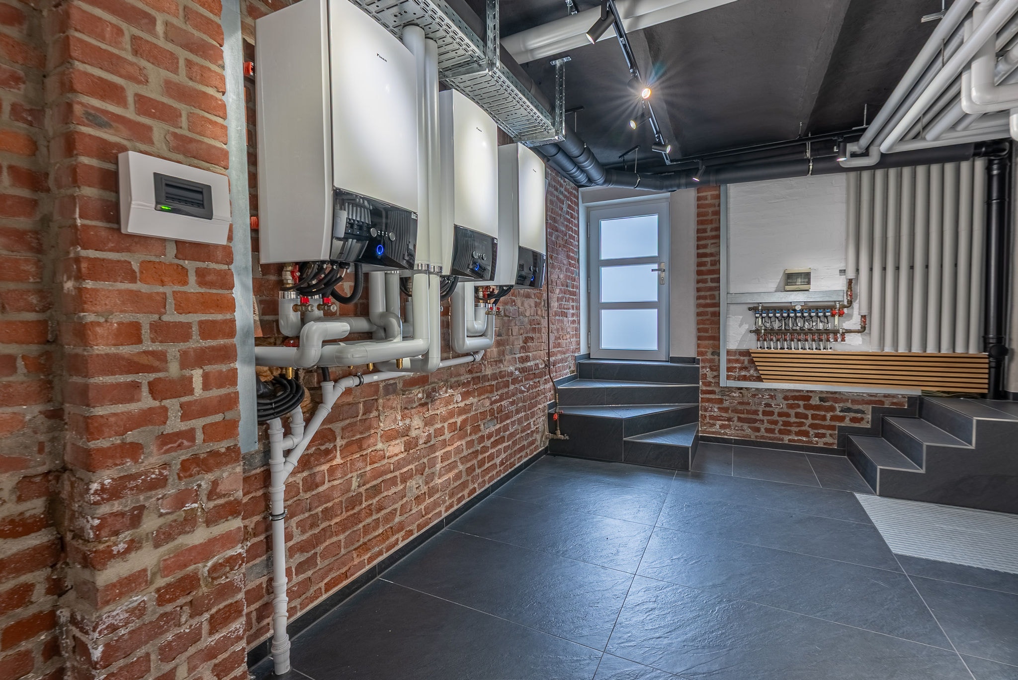 Im Verwaltungsgebäude übernimmt eine Hochtemperatur-Kaskade aus zwei Luft-Wasser-Wärmepumpen vom Typ DAIKIN Altherma 3 H HT mit einer Gesamtleistung von 28 kW die Wärmeversorgung. Als Inneneinheiten kommen zwei Hydrosplit-Module zum Einsatz; ergänzt wird das System durch einen separaten 300-Liter-Brauchwasserspeicher. Die bestehenden Heizkörper werden mit Vorlauftemperaturen von bis zu 55 °C versorgt und bedienen drei Zonen: das Obergeschoss-Büro, den Servicebereich im Obergeschoss sowie das Dachgeschoss.