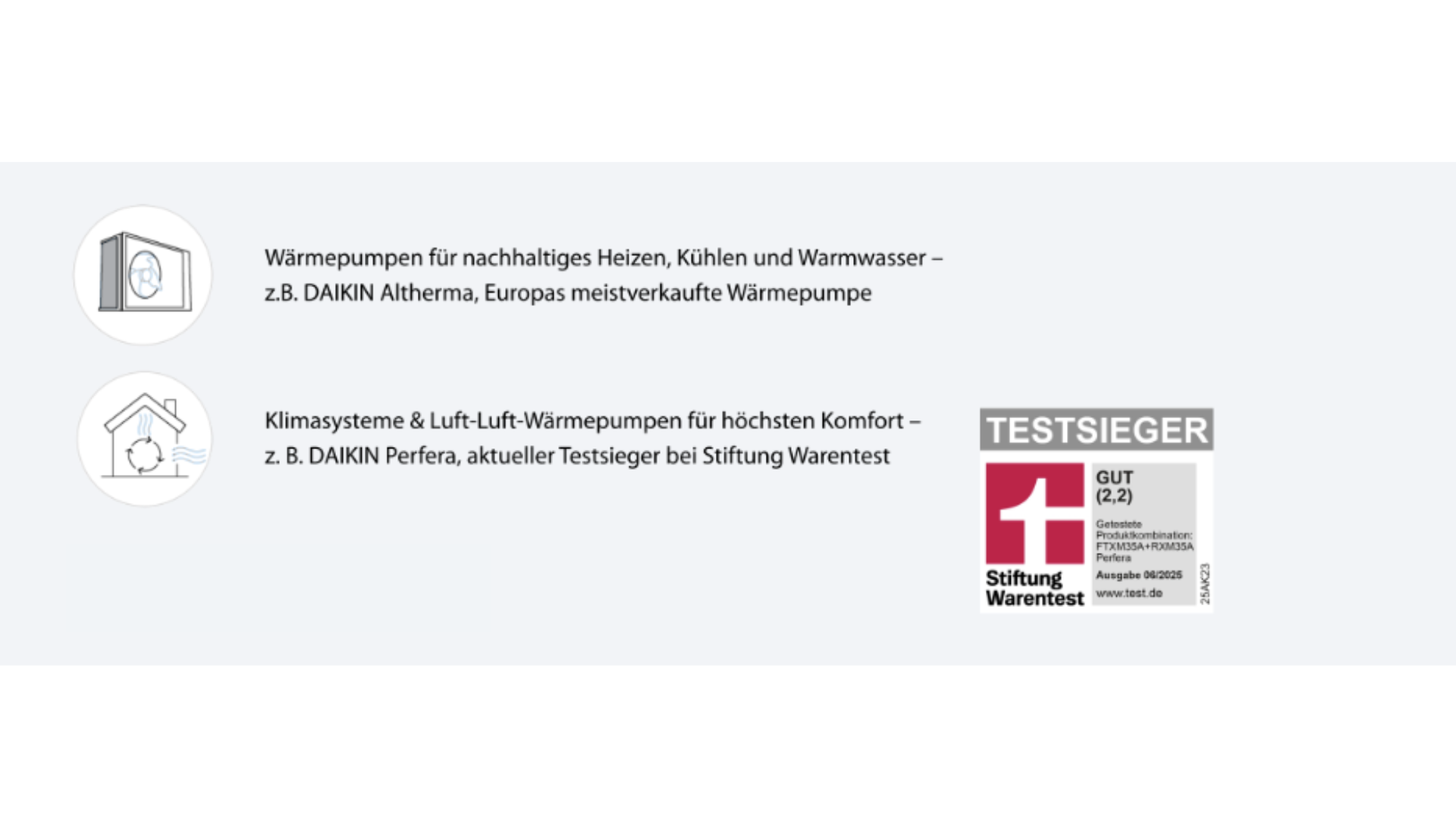 Seit über 100 Jahren steht DAIKIN weltweit für Heiz-, Kühl- und Klimasysteme – millionenfach im Einsatz, zuverlässig, effizient und sofort verfügbar beim Großhandel in Ihrer Nähe.