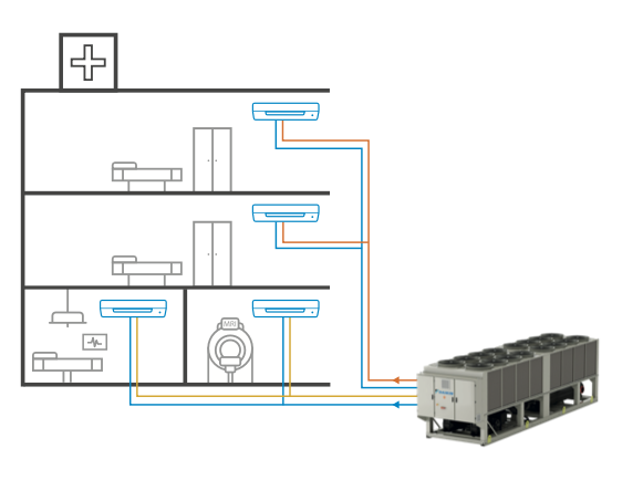 Der DAIKIN iCM sorgt für die korrekte Integration von Geräten EWYS-4Z in ein System mit verschiedenen Typen von Geräten wie ein 4-Leitungs-System mit EWYS-4Z und einem Kaltwassersatz mit Wärmerückgewinnung oder einer Wärmepumpe mit Umschaltventil für den Wechsel der Betriebsart.